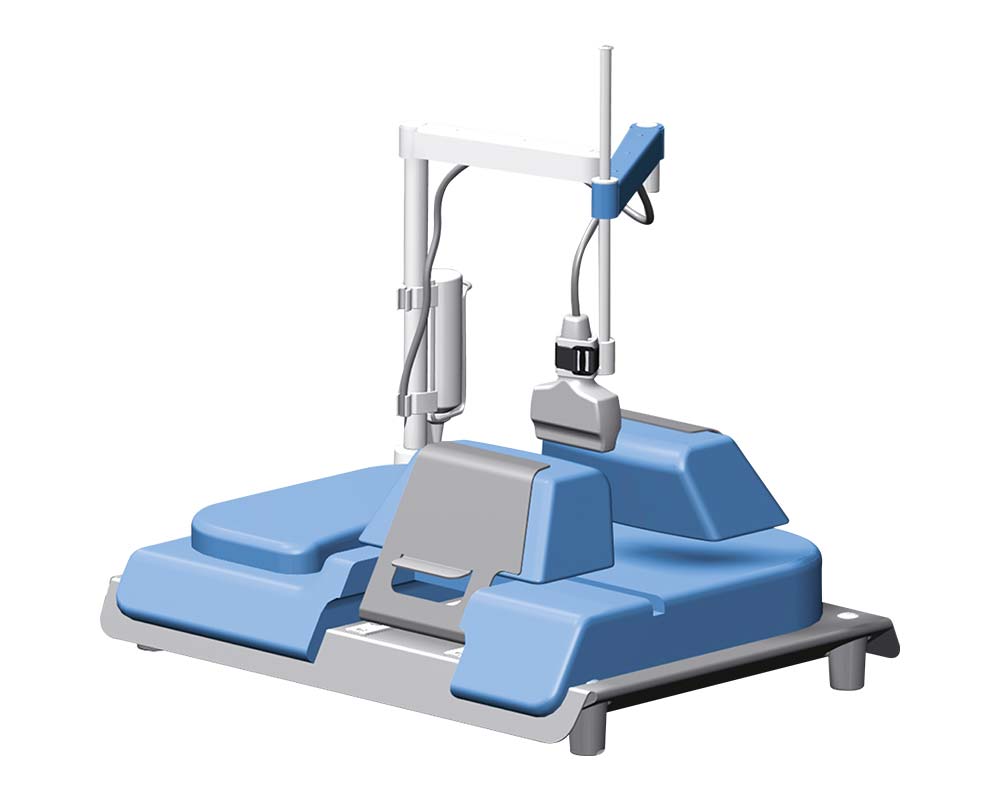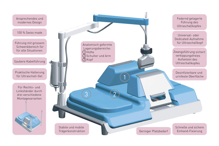 Die Führung des Ultraschallkopfes ist am gefederten Führungsarm präzise und unkompliziert, ein Kippen ist unmöglich. Je nach Anwendungsbedarf ist der Führungsarm in einem der drei Fixierungspunkte montierbar. Ebenso wurde eine praktische Halterung für das Ultraschall-Gel angebracht.